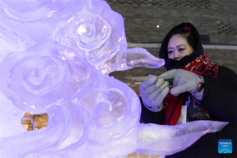 | Διαγωνιζόμενη εργάζεται πάνω σε ένα γλυπτό από πάγο κατά τη διάρκεια του πρώτου Διαγωνισμού Επαγγελματικού Σκαλίσματος Πάγου της Χειλονγκτζιάνγκ στο Harbin Ice-Snow World, στην πόλη Χαρμπίν της βόρειας Κίνας, στις 15 Ιανουαρίου 2025. (Φωτογραφία / Xinhua) |