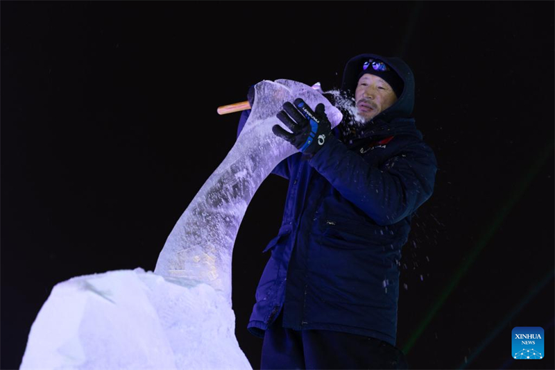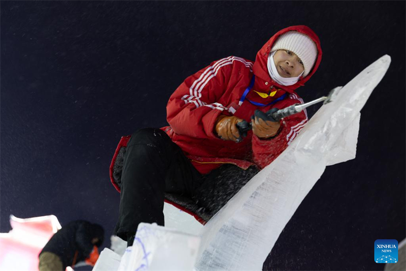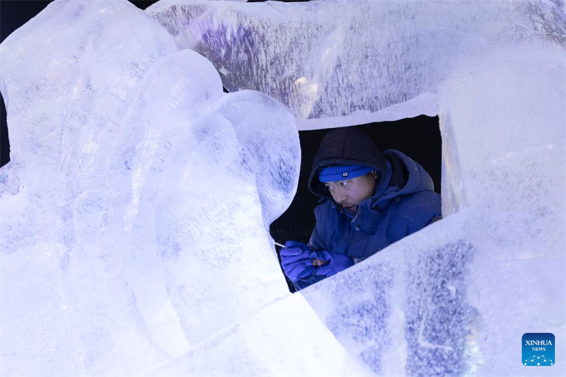 | Διαγωνιζόμενος εργάζεται πάνω σε ένα γλυπτό από πάγο κατά τη διάρκεια του πρώτου Διαγωνισμού Επαγγελματικού Σκαλίσματος Πάγου της Χειλονγκτζιάνγκ στο Harbin Ice-Snow World, στην πόλη Χαρμπίν της βόρειας Κίνας, στις 15 Ιανουαρίου 2025. (Φωτογραφία / Xinhua) |