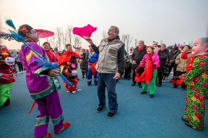 Ξένοι τουρίστες συμμετέχουν στον χορό Yangge σε ένα πάρκο στο Χαντάν, στην επαρχία Χεμπέι της βόρειας Κίνας, στις 2 Φεβρουαρίου 2025. (Φωτογραφία: Nie Changqing/People's Daily Online)