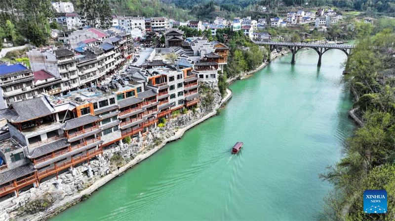 | Φωτογραφία από drone, τραβηγμένη στις 18 Μαρτίου 2025, δείχνει τουρίστες να απολαμβάνουν μια βαρκάδα στον ποταμό Τσινγκσούι, ο οποίος διασχίζει την πόλη Μπιάντσενγκ της κεντρικής επαρχίας Χουνάν της Κίνας και την πόλη Χονγκάν της νοτιοδυτικής δημοτικής περιοχής Τσονγκτσίνγκ. Φωτογραφία: Xinhua |