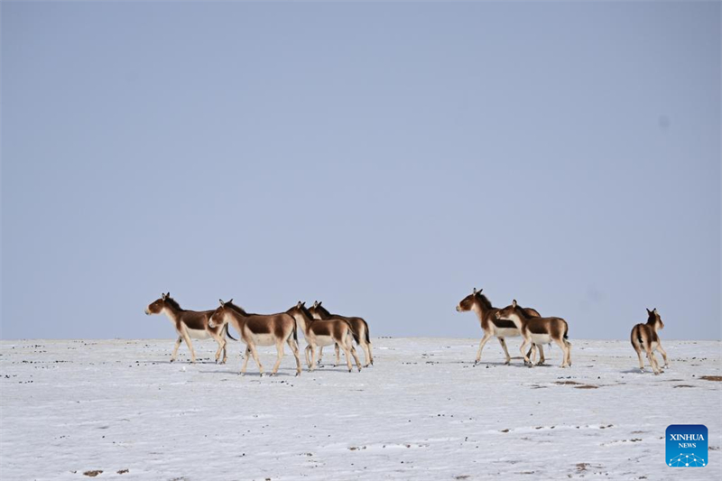 | Άγρια θιβετιανά γαϊδούρια στα χιονισμένα λιβάδια στη Θιβετιανή Αυτόνομη Νομαρχία Γκολόγκ, στην επαρχία Τσινγκχάι της βορειοδυτικής Κίνας, 6 Μαρτίου 2025. (Xinhua/Ζανγκ Λονγκ) |