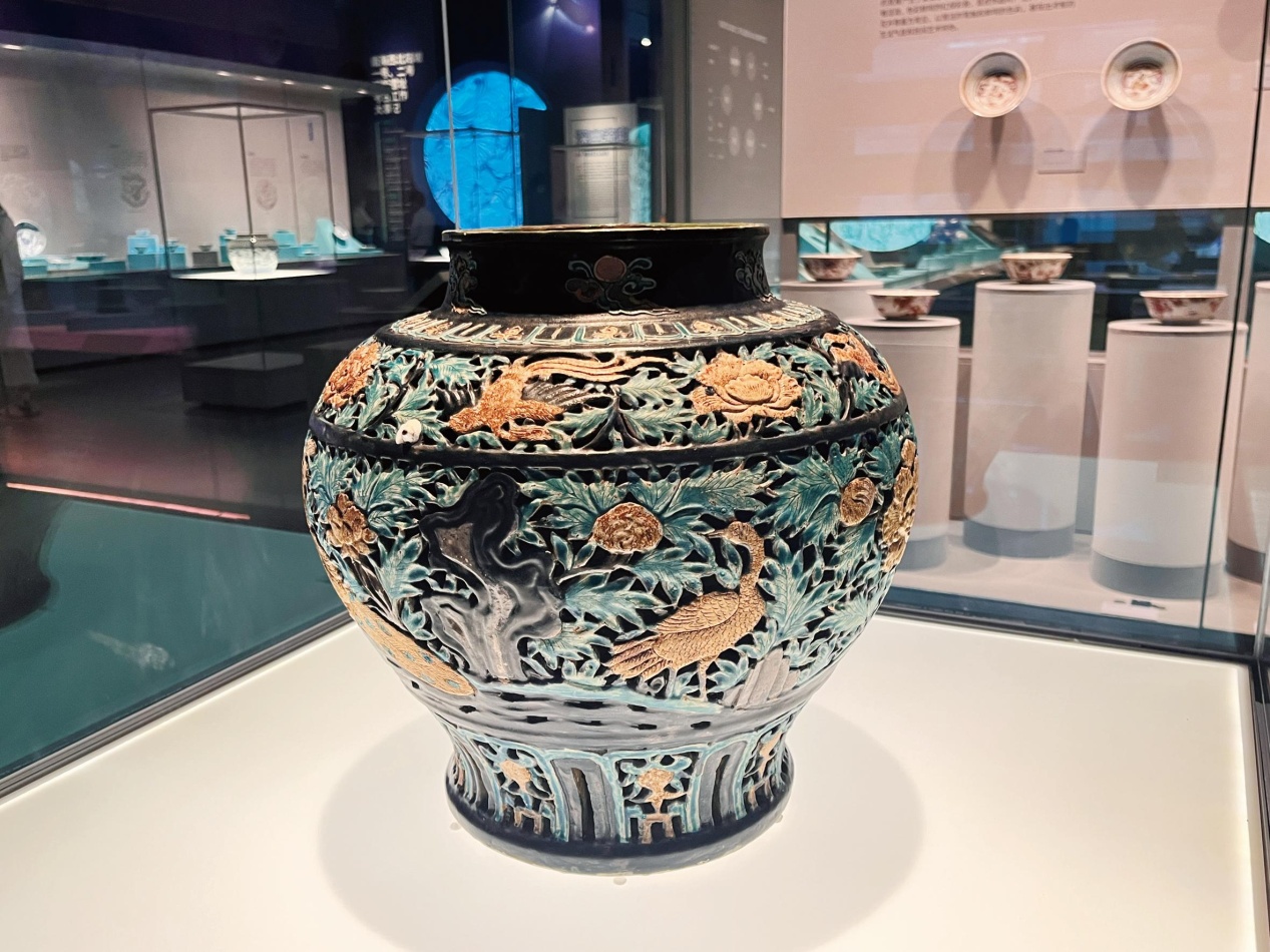 Στην αίθουσα εκτίθεται ένας μεγάλος Φαχουά (Fahua) αμφορέας με επιχρυσωμένα διακοσμητικά μοτίβα παγωνιού και παιώνιας σε διάτρητο σχέδιο, που στέκεται με ήρεμη μεγαλοπρέπεια. Το λαμπρό γυάλωμα, η περίτεχνη δικτυωτή διακόσμηση και η εκλεπτυσμένη επιχρύσωση αιχμαλωτίζουν το βλέμμα. Μόλις πέρυσι όμως, αυτό το αριστούργημα βρισκόταν ακόμη ατάραχο στον βυθό, περίπου 1.500 μέτρα κάτω από την επιφάνεια, πλάι σε περισσότερα από 100.000 κομμάτια πορσελάνης και κορμούς έβενου.
