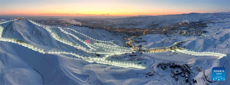 | Εναέρια φωτογραφία drone δείχνει την θέα του σούρουπου στο χιονοδρομικό κέντρο Τζιανγκτζουνσάν (Jiangjunshan) στην πόλη Αλτάι. (Φωτογραφία / Xinhua) |