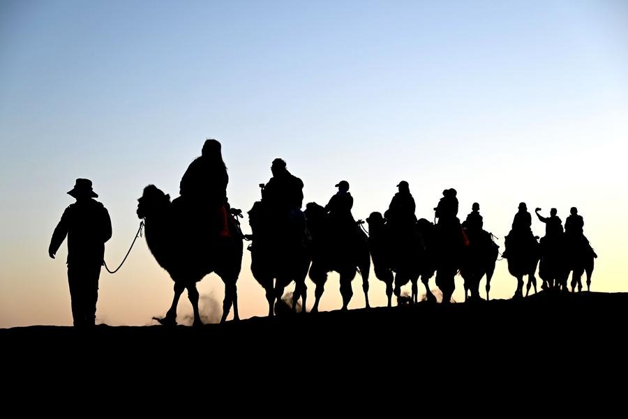 Άνθρωποι καβαλούν καμήλες στην γραφική περιοχή Crescent Spring και Mingsha Sand Dune στο Ντουνχουάνγκ, στην επαρχία Γκανσού της βορειοδυτικής Κίνας, 1 Οκτωβρίου 2025. (Φωτογραφία: Zhang Xiaoliang/Xinhua)