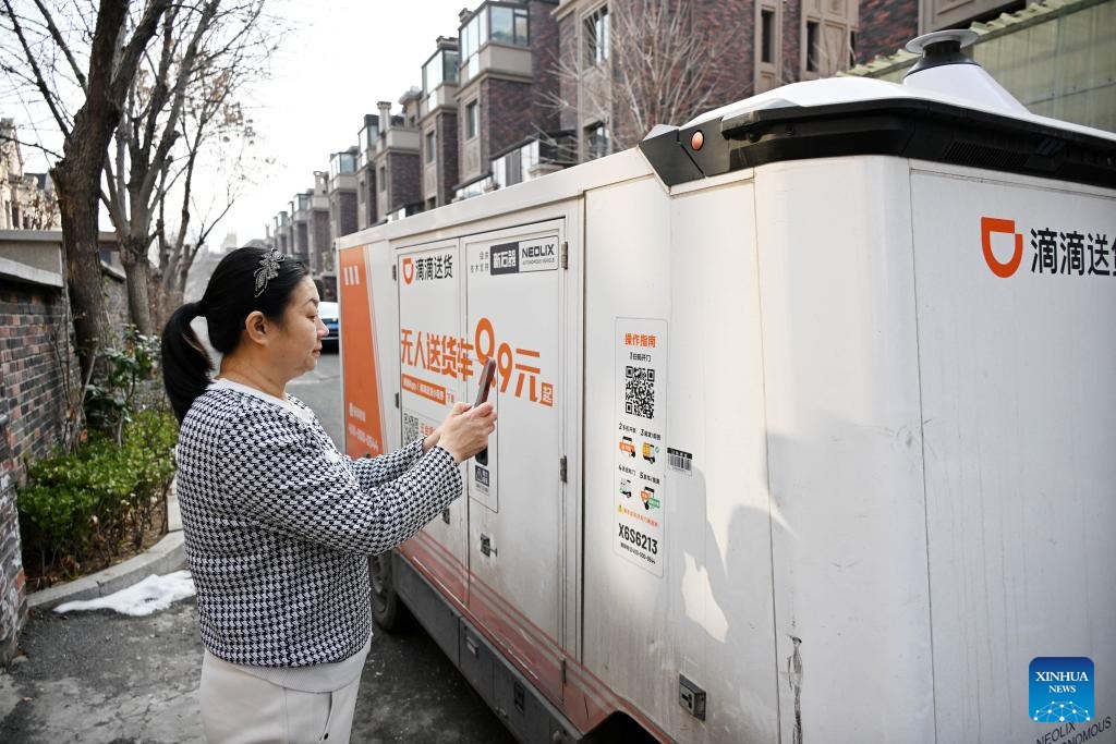 Η Τζόου Λι σκανάρει έναν κωδικό QR με το κινητό της τηλέφωνο για να παραλάβει την παραγγελία της που παραδόθηκε από ένα μη επανδρωμένο όχημα παράδοσης στο συγκρότημα κατοικιών της στην περιοχή Τσενγιάνγκ, της πόλης Τσινγκντάο, στην επαρχία Σαντόνγκ της ανατολικής Κίνας, στις 28 Ιανουαρίου του 2026.