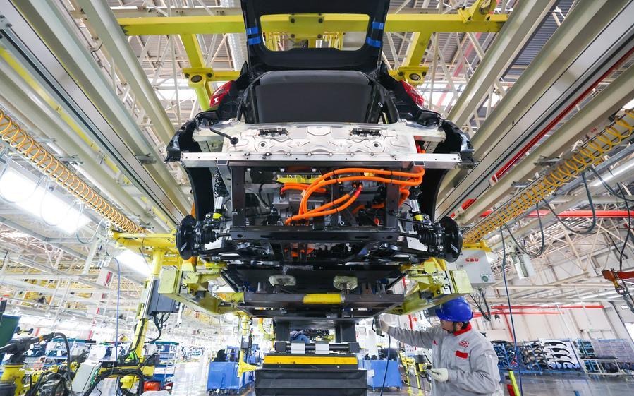 Ένας εργάτης συναρμολογεί ένα όχημα νέας ενέργειας στο εργαστήριο της κινεζικής αυτοκινητοβιομηχανίας Chery στη πόλη Σιτζιατζουάνγκ, στην επαρχία Χεμπέι της βόρειας Κίνας, στις 8 Ιανουαρίου του 2026. (Φωτογραφία: Liang Zidong/Xinhua)